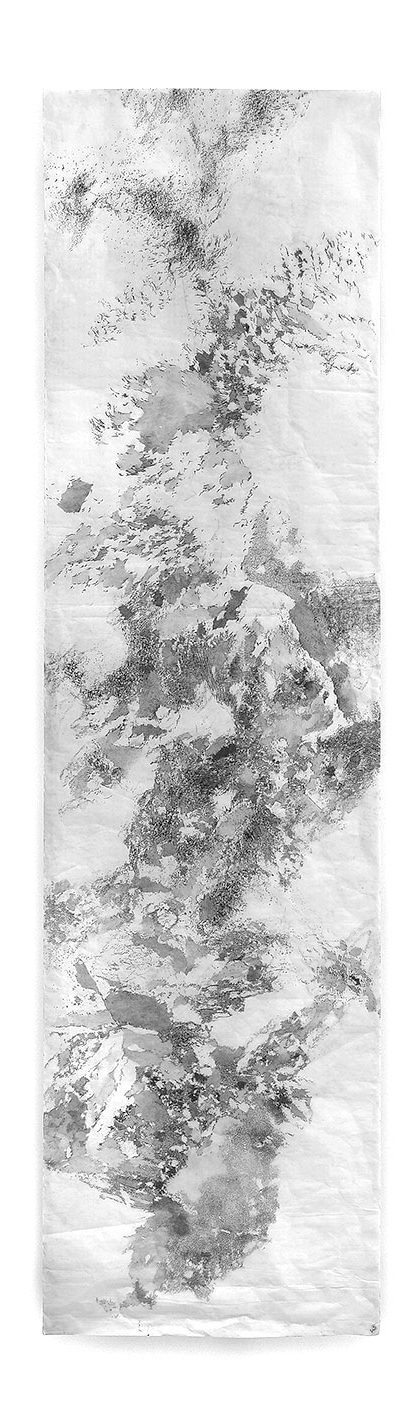 YKW : I find it appropriate that you mention the ideas of landscape, and continuum in Mariana’s work. It appears that as Mariana progresses in her activity, the work increasingly becomes a flow of consciousness; and this is another reason why there can be no beginning nor end within this flow of becoming. As if nothing other than a specific time, or a certain way of being was being represented. The limits of the rocks and mountains are being diluted, and become permeable, until they seem to be nothing other than mere markings on large rolls of paper that hang from the ceiling, and need to be read vertically - something which differs greatly from the horizontal view that we are used to seeing when looking at a landscape.