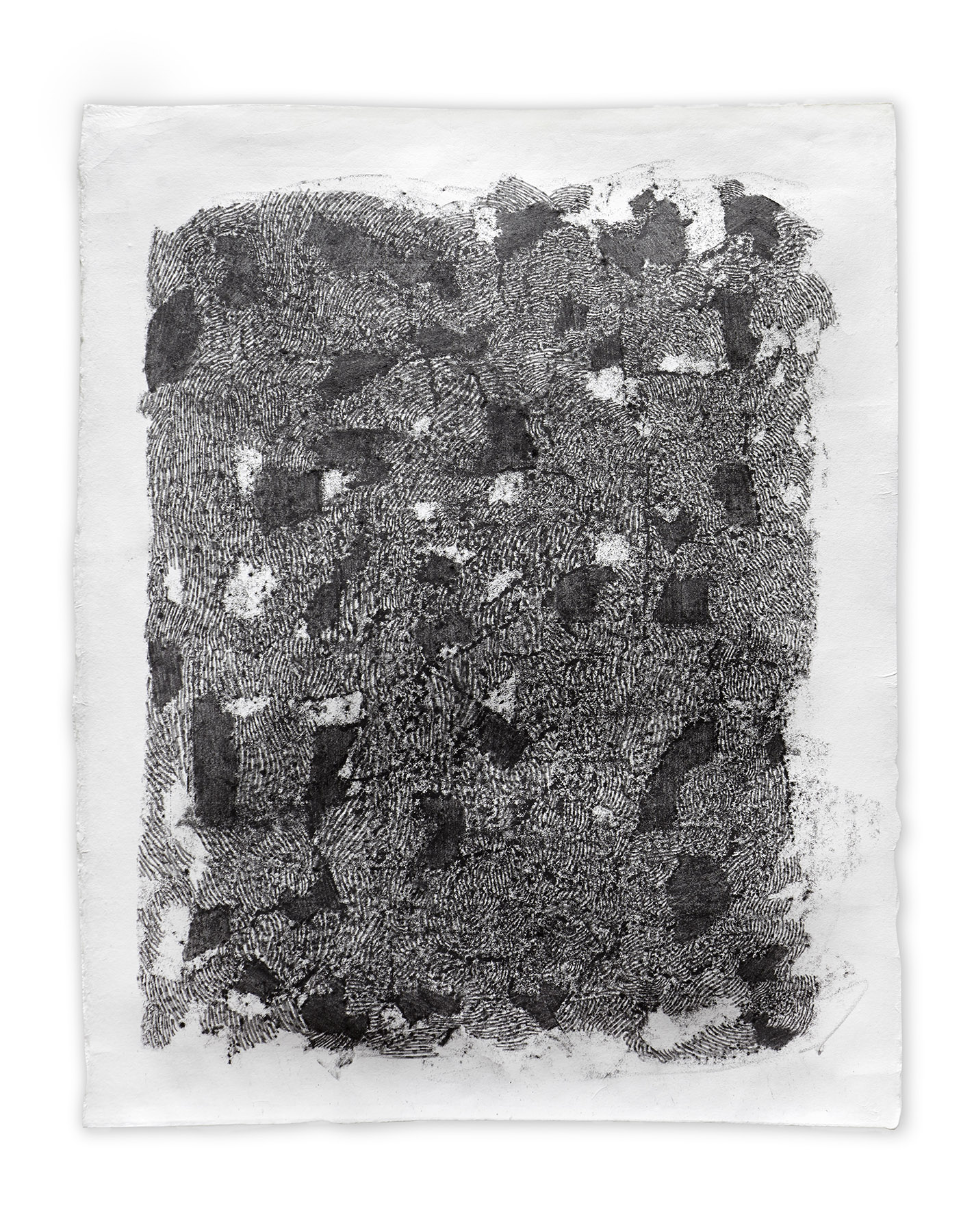 The vigorous making of these works does, in fact, attempt to emphasize, albeit gradually, the grain in the tenuous vibration of the stroke on the paper or to hide it by threading together, at an intimate and steady pace, the nodules, lumps, and cells yielded by the endless workings of the pencil. The thickness, weight, and varying coarseness of the support silently bind together the whole. After all, Sissia is suspicious of anything that might be seen as a shortcut or as a facile and flashy effect. Startlingly, in these works accents, contrasts, and emphases rendered by means of frottage appear as well, orchestrated in the ecology of the whole with an inalterable organic quality.
