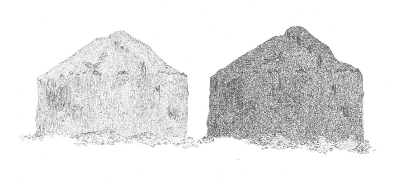 Por otra parte, y en cuanto al espíritu que parece animarlas, las agudas incisiones terráqueas y las regulares hendiduras aluden a una manualidad precaria, primitiva, y a la vez a una economía de medios mayor, ya en escala industrial o proyectual. Ambos factores hipotéticos convergen en la regularidad geométrica del trazado de las plantas arquitectónicas, las comprometen convirtiéndolas en abismales hundimientos, y a los tranquilizantes cimientos, en colapsos ortogonales de la corteza terrestre. Hasta se incluye, con una impasividad escalofriante, la figura del sepulcro, como parte de lo que podría concebirse como una referencia a algún catálogo virtual de los usos culturizados de la tierra.