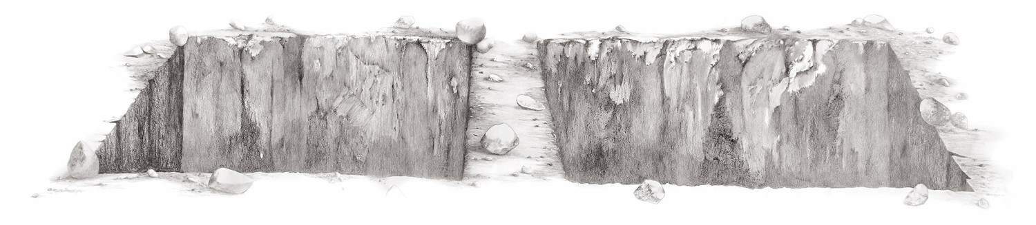 El primer dibujo de Mariana Sissia que alguna vez vi mostraba una excavación, un hoyo que se presumía profundo, representado de manera fidedigna en el plano, es decir, en el terreno, emplazado en el extremo de un eje diagonal que se completaba, un poco más arriba, a la izquierda, con la perfecta plasmación del túmulo de tierra producido al excavar, separado apenas del otro motivo. Además del llamado de atención que provocaba su innegable calidad, más destacable aún por la juventud de la autora, el dibujo me hizo pensar que la dirección natural de la lectura parecía oponerse al acto ya ejecutado de la excavación, dado que generaba una tensión de la tierra hacia el hoyo, como si una fuerza tácita la indujera a volver a rellenarlo, efecto subrayado por la gravitación del pozo en la composición. Esa inducción cinética establecía una conexión con las paradojas de la representación, y Sissia comenzaba, así de tempranamente, a reflexionar sobre los dilemas de su propio métier –tanto en lo que hace a la construcción de la imagen como al ejercicio activo del dibujo–, bajo la forma de una velada alegoría, o bien como una intencionada metáfora.