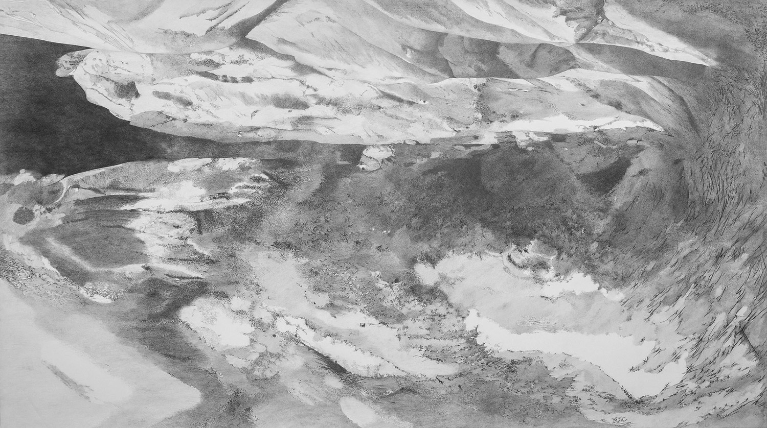 TDS: Si, yo diría que cada vez dibuja más momentos que figuras, instancias temporales de estar en ese momento y de esa manera. Lo que va predominando es una imagen más austera y menos representativa, las obras se vuelven más un registro de texturas, una vista aérea cada vez más distante donde ya no se ve la montaña si no su textura. Por momentos son una acumulación de restos y de repente, son como pequeñas excavaciones en un terreno absolutamente árido, donde ya no tiene valor hacer ninguna representación puntual. Por eso se excede y cada vez se vuelve más inapropiado hablar de paisajes. Porque lo que ha venido haciendo, es ir demoliendo todo resto reconocible de representación y lo predominante es el vínculo fuerte con la materia y la representación de la experiencia real de representar. Como una experiencia desnuda del dibujar mismo, cada vez más cruda, más directa y sin rotura, diría. Cada vez se refuerza la idea del continuum, donde ya casi no queda tiempo para el detalle.