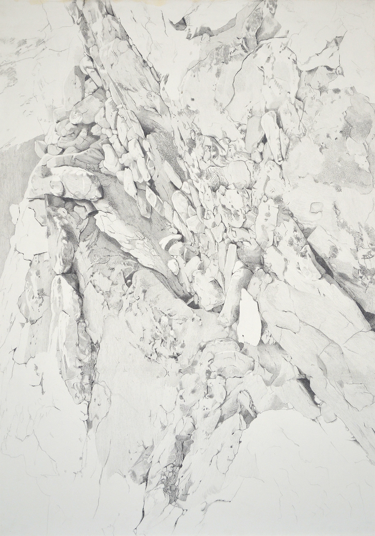 Si bien no tan románticas como el trabajo de la Volcano School (un improbable grupo de pintores que se radicaron en Hawái durante la segunda mitad del siglo XIX con la intención de retratar algunas emocionantes erupciones volcánicas), los dibujos de Mariana Sissia se inscriben también en cierta tradición que adscribe un potencial dramático a lo mineral. Una aptitud técnica incomparable puesta al servicio de las excavaciones, las grietas y las fallas, iguala al fruto de su labor con los gráficos de estudio que producen ciertas disciplinas científicas como la estratigrafía y la topografía. Y a pesar de que la artista se empeñe en sembrar trampas y desvíos sobre sus paisajes, la capacidad intrínseca de contención de información gráfica que ostentan los vuelve igual de confiables que cualquier fotografía satelital. Luego de haber cursado su licenciatura en pintura en la Universidad de Rosario, sobrevino en la vida de Sissia un período traumático de adaptación a la vida en Buenos Aires que dio como resultado Sistema de defensa de mí misma, serie de trabajos con la que irrumpió en la escena de arte porteña en el año 2009. Este conjunto de dibujos en grafito profusamente detallados muestra porciones aisladas de terreno; fosas de una profundidad incalculable; sitios de excavación acordonados; islotes de tierra cortados transversalmente para revelar conductos subterráneos. Es, en resumidas cuentas, una colección de incisiones sobre la superficie del paisaje, hechas con el fin de anular la intrusión de cualquier elemento amenazante para el confort emocional. Las obras se sienten distantes e inexpresivas, a tono con la severidad de su técnica y la jerga lacónica, levemente sarcástica, que emplea para designar a las distintas posiciones de su sistema de defensa. Sin embargo, un área de intimidad y flaqueza se evidencia en la carga simbólica que los trabajos encierran, representada por la aparición de elementos que no encuentran su razón de ser en un entorno aparentemente desolado. Toboganes que recorren con dedicación las escarpas para desembocar en pozos. Un subibaja anulado, que no puede cumplir su función natural a causa de un montículo de tierra que se lo impide. Sissia le da un tratamiento a la las extensiones terrestres hasta convertirlas en campos de juego para un espíritu pasivo-agresivo. Son panoramas estériles, pero trastocados de manera tal que un cierto viso de rencor y recelo los atraviesa. La efectividad de estos cepos está por comprobarse, ya que ningún personaje, animal o humano aparece merodeando; quizá hayan caído en desuso durante épocas de paz y no volvieron a ser necesarios. La pieza central de la serie, Trinchera, supera los 4 metros de longitud y representa de manera casi facsimilar un paraje rocoso en panorámica en el que es imposible no detenerse al menos un par de minutos. Trinchera resume el pleno alcance de la labor de Sissia, a la vez que lo magnifica hasta un límite vertiginoso. Para la artista acabó siendo una especie de revelación: al encontrarse frente una pieza tan minuciosamente construida, comienza a prestar mayor atención a los detalles que componen las distintas zonas de sus dibujos y se propone sondearlos para capitalizar su valor estético. Así, se centra en los fragmentos y en esos fragmentos labra la abstracción. Invirtiendo cabeza abajo los paisajes o sobredimensionando algunos pequeños elementos, empieza a darle forma a un mundo de geometría geológica casi fractal. Esta tendencia se asienta durante 2011, año en el que es seleccionada para formar parte del programa de artistas de la Universidad Torcuato di Tella y, a partir del intercambio que se genera en espacios de clínica, su obra comienza a tomar otro volúmen; a separarse de su carácter ilustrativo para cargarse de un temple más expresivo. Como dato curioso, durante esta época la artista dice haber escuchado mucho el Five leaves left de Nick Drake, un disco de producción rudimentaria, con arreglos tenues y un sonido dislocado que se levanta como contrapunto interesante frente a la precisión y los rasgos densos que aparecen en los trabajos de Sissia. En el tiempo muerto entre esta transición de objetivos, se aventura brevemente al videoarte y entrega una pieza de corta duración denominada Excavación 1: monumento introspectivo. En ella puede verse a un dúo de excavadores en un campito bajo un cielo gris, removiendo tierra dentro de un espacio cuidadosamente delimitado con cinta de medir para que forme la palabra “YO”. Aunque el video termina antes de que al proceso le llegue su conclusión, la obra es proyectada junto a una fotografía que retrata el aspecto final del vaciado, ahora sin los trabajadores ni las herramientas de agrimensura. En esta acción de llevar a un plano tridimensional las fantasías de extracción que aparecen en sus dibujos, Sissia se inscribe de un modo más directo tanto en la corriente del Land Art –quizá con Michael Heizer como elemento de referencia más cercano–, así como también en los procesos performáticos y de documentación que la arriman tímidamente al trabajo de Francis Alÿs. Más recientemente, una mayor compenetración con el acto físico de dibujar la lleva a realizar excursiones formales en las que ensaya variables sobre la operación en sí misma, apelando a giros drásticos en su manera de ejercer con el grafito presión sobre el papel; reformando la velocidad del trazo y el eje de inclinación de sus herramientas. El método prevalece por sobre los conceptos y los planes definidos previamente. Los resultados de este vuelco son abstracciones y juegos de producción que la artista relaciona de alguna manera con el método surrealista. Instigando una movilidad aguda en los sectores de mayor densidad cromática, lo firme del terreno empieza a desmaterializarse; se vuelve vago y más vago hasta que alcanza un estado de sublimación. Variaciones de una rara especie de expresionismo tecn