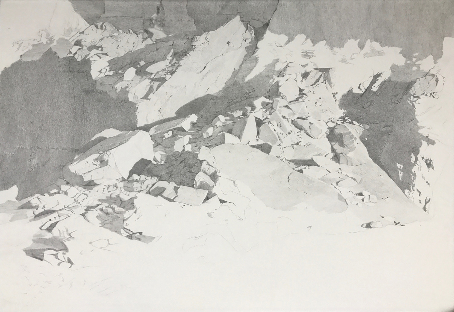 Si bien no tan románticas como el trabajo de la Volcano School (un improbable grupo de pintores que se radicaron en Hawái durante la segunda mitad del siglo XIX con la intención de retratar algunas emocionantes erupciones volcánicas), los dibujos de Mariana Sissia se inscriben también en cierta tradición que adscribe un potencial dramático a lo mineral. Una aptitud técnica incomparable puesta al servicio de las excavaciones, las grietas y las fallas, iguala al fruto de su labor con los gráficos de estudio que producen ciertas disciplinas científicas como la estratigrafía y la topografía. Y a pesar de que la artista se empeñe en sembrar trampas y desvíos sobre sus paisajes, la capacidad intrínseca de contención de información gráfica que ostentan los vuelve igual de confiables que cualquier fotografía satelital. Luego de haber cursado su licenciatura en pintura en la Universidad de Rosario, sobrevino en la vida de Sissia un período traumático de adaptación a la vida en Buenos Aires que dio como resultado Sistema de defensa de mí misma, serie de trabajos con la que irrumpió en la escena de arte porteña en el año 2009. Este conjunto de dibujos en grafito profusamente detallados muestra porciones aisladas de terreno; fosas de una profundidad incalculable; sitios de excavación acordonados; islotes de tierra cortados transversalmente para revelar conductos subterráneos. Es, en resumidas cuentas, una colección de incisiones sobre la superficie del paisaje, hechas con el fin de anular la intrusión de cualquier elemento amenazante para el confort emocional. Las obras se sienten distantes e inexpresivas, a tono con la severidad de su técnica y la jerga lacónica, levemente sarcástica, que emplea para designar a las distintas posiciones de su sistema de defensa. Sin embargo, un área de intimidad y flaqueza se evidencia en la carga simbólica que los trabajos encierran, representada por la aparición de elementos que no encuentran su razón de ser en un entorno aparentemente desolado. Toboganes que recorren con dedicación las escarpas para desembocar en pozos. Un subibaja anulado, que no puede cumplir su función natural a causa de un montículo de tierra que se lo impide. Sissia le da un tratamiento a la las extensiones terrestres hasta convertirlas en campos de juego para un espíritu pasivo-agresivo. Son panoramas estériles, pero trastocados de manera tal que un cierto viso de rencor y recelo los atraviesa. La efectividad de estos cepos está por comprobarse, ya que ningún personaje, animal o humano aparece merodeando; quizá hayan caído en desuso durante épocas de paz y no volvieron a ser necesarios. La pieza central de la serie, Trinchera, supera los 4 metros de longitud y representa de manera casi facsimilar un paraje rocoso en panorámica en el que es imposible no detenerse al menos un par de minutos. Trinchera resume el pleno alcance de la labor de Sissia, a la vez que lo magnifica hasta un límite vertiginoso. Para la artista acabó siendo una especie de revelación: al encontrarse frente una pieza tan minuciosamente construida, comienza a prestar mayor atención a los detalles que componen las distintas zonas de sus dibujos y se propone sondearlos para capitalizar su valor estético. Así, se centra en los fragmentos y en esos fragmentos labra la abstracción. Invirtiendo cabeza abajo los paisajes o sobredimensionando algunos pequeños elementos, empieza a darle forma a un mundo de geometría geológica casi fractal. Esta tendencia se asienta durante 2011, año en el que es seleccionada para formar parte del programa de artistas de la Universidad Torcuato di Tella y, a partir del intercambio que se genera en espacios de clínica, su obra comienza a tomar otro volúmen; a separarse de su carácter ilustrativo para cargarse de un temple más expresivo. Como dato curioso, durante esta época la artista dice haber escuchado mucho el Five leaves left de Nick Drake, un disco de producción rudimentaria, con arreglos tenues y un sonido dislocado que se levanta como contrapunto interesante frente a la precisión y los rasgos densos que aparecen en los trabajos de Sissia. En el tiempo muerto entre esta transición de objetivos, se aventura brevemente al videoarte y entrega una pieza de corta duración denominada Excavación 1: monumento introspectivo. En ella puede verse a un dúo de excavadores en un campito bajo un cielo gris, removiendo tierra dentro de un espacio cuidadosamente delimitado con cinta de medir para que forme la palabra “YO”. Aunque el video termina antes de que al proceso le llegue su conclusión, la obra es proyectada junto a una fotografía que retrata el aspecto final del vaciado, ahora sin los trabajadores ni las herramientas de agrimensura. En esta acción de llevar a un plano tridimensional las fantasías de extracción que aparecen en sus dibujos, Sissia se inscribe de un modo más directo tanto en la corriente del Land Art –quizá con Michael Heizer como elemento de referencia más cercano–, así como también en los procesos performáticos y de documentación que la arriman tímidamente al trabajo de Francis Alÿs. Más recientemente, una mayor compenetración con el acto físico de dibujar la lleva a realizar excursiones formales en las que ensaya variables sobre la operación en sí misma, apelando a giros drásticos en su manera de ejercer con el grafito presión sobre el papel; reformando la velocidad del trazo y el eje de inclinación de sus herramientas. El método prevalece por sobre los conceptos y los planes definidos previamente. Los resultados de este vuelco son abstracciones y juegos de producción que la artista relaciona de alguna manera con el método surrealista. Instigando una movilidad aguda en los sectores de mayor densidad cromática, lo firme del terreno empieza a desmaterializarse; se vuelve vago y más vago hasta que alcanza un estado de sublimación. Variaciones de una rara especie de expresionismo tecn