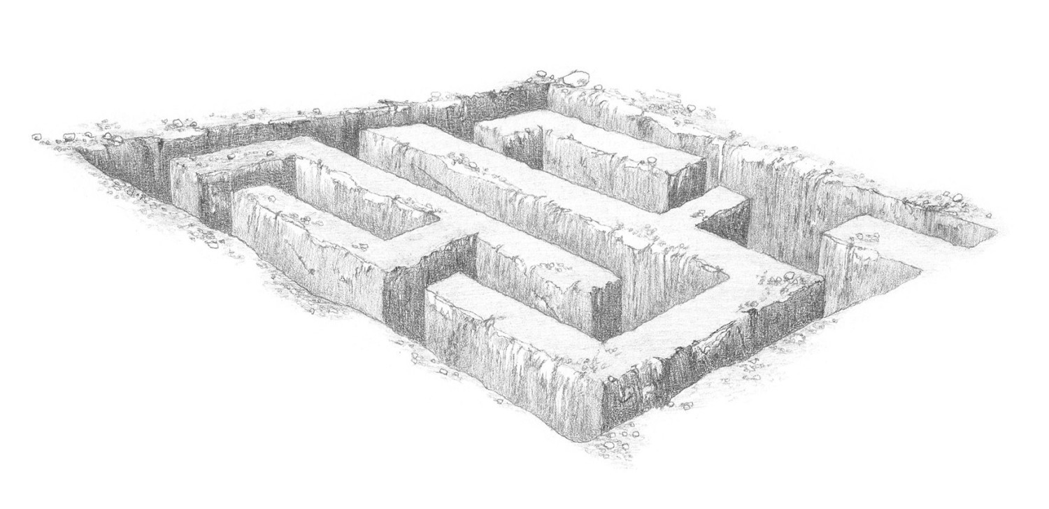Por otra parte, y en cuanto al espíritu que parece animarlas, las agudas incisiones terráqueas y las regulares hendiduras aluden a una manualidad precaria, primitiva, y a la vez a una economía de medios mayor, ya en escala industrial o proyectual. Ambos factores hipotéticos convergen en la regularidad geométrica del trazado de las plantas arquitectónicas, las comprometen convirtiéndolas en abismales hundimientos, y a los tranquilizantes cimientos, en colapsos ortogonales de la corteza terrestre. Hasta se incluye, con una impasividad escalofriante, la figura del sepulcro, como parte de lo que podría concebirse como una referencia a algún catálogo virtual de los usos culturizados de la tierra.
