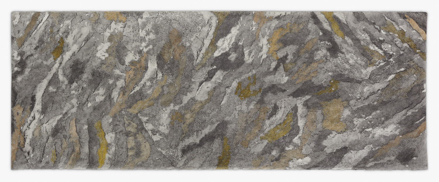 YKW: Me parece apropiado esto que mencionas sobre la noción de paisaje, y el continuum de la ora de Mariana. Pareciera que a medida que ella avanza en su actividad, la obra se va volviendo cada vez más un fluir de la conciencia, y que por eso tampoco puede haber un principio o fin en este magma del devenir. Como si ya no se representara nada más que cierta duración, o cierto modo de existir. Las rocas, las montañas van cediendo sus límites, se vuelven porosas, hasta ser meras inscripciones en rollos que se cuelgan del techo y que requieren una lectura vertical, muy diferente a la horizontalidad con que acostumbramos a mirar un paisaje.