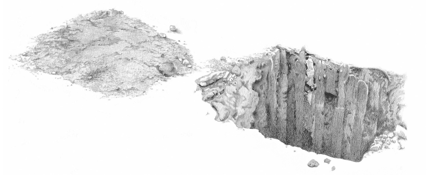 El primer dibujo de Mariana Sissia que alguna vez vi mostraba una excavación, un hoyo que se presumía profundo, representado de manera fidedigna en el plano, es decir, en el terreno, emplazado en el extremo de un eje diagonal que se completaba, un poco más arriba, a la izquierda, con la perfecta plasmación del túmulo de tierra producido al excavar, separado apenas del otro motivo. Además del llamado de atención que provocaba su innegable calidad, más destacable aún por la juventud de la autora, el dibujo me hizo pensar que la dirección natural de la lectura parecía oponerse al acto ya ejecutado de la excavación, dado que generaba una tensión de la tierra hacia el hoyo, como si una fuerza tácita la indujera a volver a rellenarlo, efecto subrayado por la gravitación del pozo en la composición. Esa inducción cinética establecía una conexión con las paradojas de la representación, y Sissia comenzaba, así de tempranamente, a reflexionar sobre los dilemas de su propio métier –tanto en lo que hace a la construcción de la imagen como al ejercicio activo del dibujo–, bajo la forma de una velada alegoría, o bien como una intencionada metáfora.