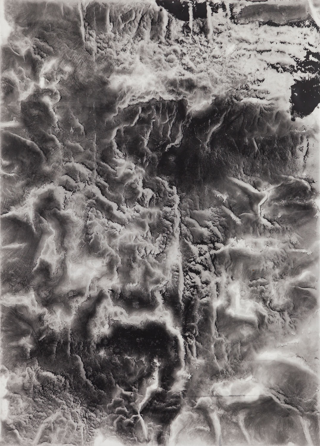 TDS: Si, yo diría que cada vez dibuja más momentos que figuras, instancias temporales de estar en ese momento y de esa manera. Lo que va predominando es una imagen más austera y menos representativa, las obras se vuelven más un registro de texturas, una vista aérea cada vez más distante donde ya no se ve la montaña si no su textura. Por momentos son una acumulación de restos y de repente, son como pequeñas excavaciones en un terreno absolutamente árido, donde ya no tiene valor hacer ninguna representación puntual. Por eso se excede y cada vez se vuelve más inapropiado hablar de paisajes. Porque lo que ha venido haciendo, es ir demoliendo todo resto reconocible de representación y lo predominante es el vínculo fuerte con la materia y la representación de la experiencia real de representar. Como una experiencia desnuda del dibujar mismo, cada vez más cruda, más directa y sin rotura, diría. Cada vez se refuerza la idea del continuum, donde ya casi no queda tiempo para el detalle.