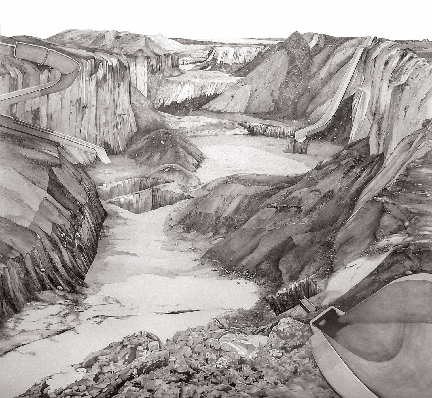 Si bien no tan románticas como el trabajo de la Volcano School (un improbable grupo de pintores que se radicaron en Hawái durante la segunda mitad del siglo XIX con la intención de retratar algunas emocionantes erupciones volcánicas), los dibujos de Mariana Sissia se inscriben también en cierta tradición que adscribe un potencial dramático a lo mineral. Una aptitud técnica incomparable puesta al servicio de las excavaciones, las grietas y las fallas, iguala al fruto de su labor con los gráficos de estudio que producen ciertas disciplinas científicas como la estratigrafía y la topografía. Y a pesar de que la artista se empeñe en sembrar trampas y desvíos sobre sus paisajes, la capacidad intrínseca de contención de información gráfica que ostentan los vuelve igual de confiables que cualquier fotografía satelital. Luego de haber cursado su licenciatura en pintura en la Universidad de Rosario, sobrevino en la vida de Sissia un período traumático de adaptación a la vida en Buenos Aires que dio como resultado Sistema de defensa de mí misma, serie de trabajos con la que irrumpió en la escena de arte porteña en el año 2009. Este conjunto de dibujos en grafito profusamente detallados muestra porciones aisladas de terreno; fosas de una profundidad incalculable; sitios de excavación acordonados; islotes de tierra cortados transversalmente para revelar conductos subterráneos. Es, en resumidas cuentas, una colección de incisiones sobre la superficie del paisaje, hechas con el fin de anular la intrusión de cualquier elemento amenazante para el confort emocional. Las obras se sienten distantes e inexpresivas, a tono con la severidad de su técnica y la jerga lacónica, levemente sarcástica, que emplea para designar a las distintas posiciones de su sistema de defensa. Sin embargo, un área de intimidad y flaqueza se evidencia en la carga simbólica que los trabajos encierran, representada por la aparición de elementos que no encuentran su razón de ser en un entorno aparentemente desolado. Toboganes que recorren con dedicación las escarpas para desembocar en pozos. Un subibaja anulado, que no puede cumplir su función natural a causa de un montículo de tierra que se lo impide. Sissia le da un tratamiento a la las extensiones terrestres hasta convertirlas en campos de juego para un espíritu pasivo-agresivo. Son panoramas estériles, pero trastocados de manera tal que un cierto viso de rencor y recelo los atraviesa. La efectividad de estos cepos está por comprobarse, ya que ningún personaje, animal o humano aparece merodeando; quizá hayan caído en desuso durante épocas de paz y no volvieron a ser necesarios. La pieza central de la serie, Trinchera, supera los 4 metros de longitud y representa de manera casi facsimilar un paraje rocoso en panorámica en el que es imposible no detenerse al menos un par de minutos. Trinchera resume el pleno alcance de la labor de Sissia, a la vez que lo magnifica hasta un límite vertiginoso. Para la artista acabó siendo una especie de revelación: al encontrarse frente una pieza tan minuciosamente construida, comienza a prestar mayor atención a los detalles que componen las distintas zonas de sus dibujos y se propone sondearlos para capitalizar su valor estético. Así, se centra en los fragmentos y en esos fragmentos labra la abstracción. Invirtiendo cabeza abajo los paisajes o sobredimensionando algunos pequeños elementos, empieza a darle forma a un mundo de geometría geológica casi fractal. Esta tendencia se asienta durante 2011, año en el que es seleccionada para formar parte del programa de artistas de la Universidad Torcuato di Tella y, a partir del intercambio que se genera en espacios de clínica, su obra comienza a tomar otro volúmen; a separarse de su carácter ilustrativo para cargarse de un temple más expresivo. Como dato curioso, durante esta época la artista dice haber escuchado mucho el Five leaves left de Nick Drake, un disco de producción rudimentaria, con arreglos tenues y un sonido dislocado que se levanta como contrapunto interesante frente a la precisión y los rasgos densos que aparecen en los trabajos de Sissia. En el tiempo muerto entre esta transición de objetivos, se aventura brevemente al videoarte y entrega una pieza de corta duración denominada Excavación 1: monumento introspectivo. En ella puede verse a un dúo de excavadores en un campito bajo un cielo gris, removiendo tierra dentro de un espacio cuidadosamente delimitado con cinta de medir para que forme la palabra “YO”. Aunque el video termina antes de que al proceso le llegue su conclusión, la obra es proyectada junto a una fotografía que retrata el aspecto final del vaciado, ahora sin los trabajadores ni las herramientas de agrimensura. En esta acción de llevar a un plano tridimensional las fantasías de extracción que aparecen en sus dibujos, Sissia se inscribe de un modo más directo tanto en la corriente del Land Art –quizá con Michael Heizer como elemento de referencia más cercano–, así como también en los procesos performáticos y de documentación que la arriman tímidamente al trabajo de Francis Alÿs. Más recientemente, una mayor compenetración con el acto físico de dibujar la lleva a realizar excursiones formales en las que ensaya variables sobre la operación en sí misma, apelando a giros drásticos en su manera de ejercer con el grafito presión sobre el papel; reformando la velocidad del trazo y el eje de inclinación de sus herramientas. El método prevalece por sobre los conceptos y los planes definidos previamente. Los resultados de este vuelco son abstracciones y juegos de producción que la artista relaciona de alguna manera con el método surrealista. Instigando una movilidad aguda en los sectores de mayor densidad cromática, lo firme del terreno empieza a desmaterializarse; se vuelve vago y más vago hasta que alcanza un estado de sublimación. Variaciones de una rara especie de expresionismo tecn