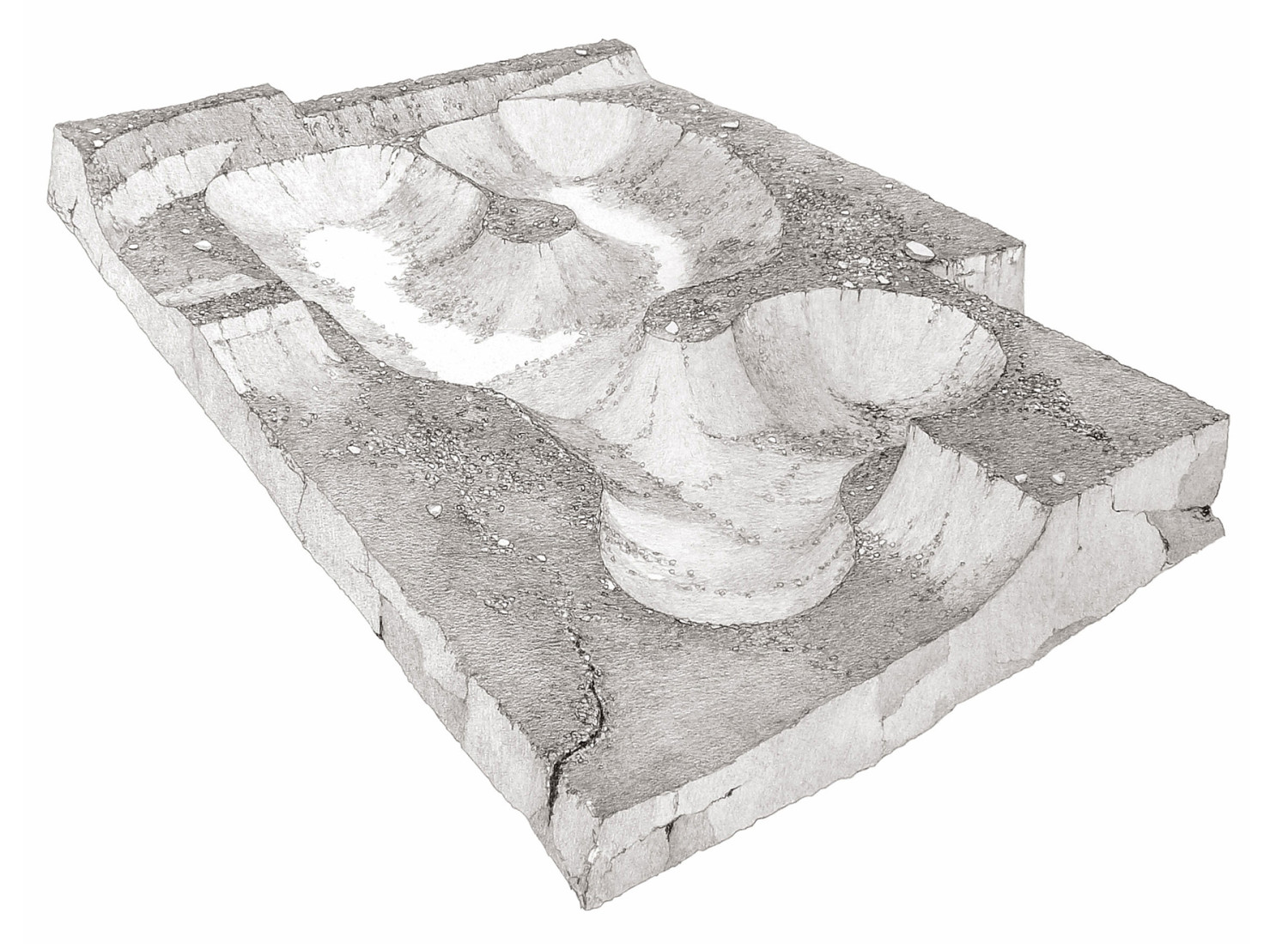 Es notable la amplitud polisémica del método, del procedimiento de Sissia, tan estratégicamente tributario de la iconografía geológica como de aquella del universo espeleológico, junto a simulacros de transcripciones de trabajos de campo arqueológicos, que ella recrea como en una cadena de referencias a instalaciones públicas tan contemporáneas como las pistas de skate, solo que transformadas aquí en un resto fósil disecado. Los hoyos y pozos regulares que agujerean el suelo áspero se abisman en él teñidos de duplicidad, provistos de una cierta racionalidad objetiva, y a la vez embebidos del vértigo de lo bizarro, como si dentro de esa tierra ilusoria pudiera palpitarse la vida oculta de un inframundo incógnito.