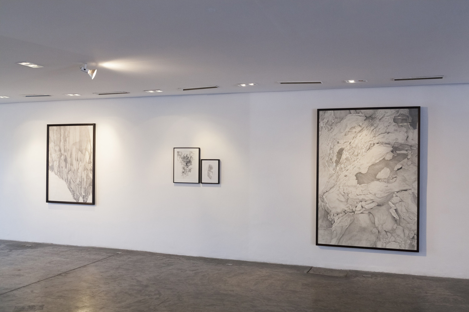YKW: Me parece apropiado esto que mencionas sobre la noción de paisaje, y el continuum de la ora de Mariana. Pareciera que a medida que ella avanza en su actividad, la obra se va volviendo cada vez más un fluir de la conciencia, y que por eso tampoco puede haber un principio o fin en este magma del devenir. Como si ya no se representara nada más que cierta duración, o cierto modo de existir. Las rocas, las montañas van cediendo sus límites, se vuelven porosas, hasta ser meras inscripciones en rollos que se cuelgan del techo y que requieren una lectura vertical, muy diferente a la horizontalidad con que acostumbramos a mirar un paisaje.