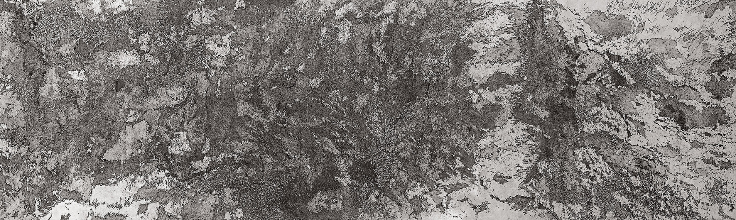 El viraje sistemático que Sissia va a emprender resueltamente empieza a anunciarse de manera gradual, apuntando a un cambio radical en el punto de vista y en el diseño y utilización del verosímil espacial. Sissia sobrevolará cráteres y describirá laderas, cimas, riscos y picos montañosos, oscilando entre la mímesis y la invención imaginaria. En los mínimos detalles de esos accidentes orográficos acecha, inminente, una transición rotunda que irrumpirá en la concepción global de su programa, y que va a llevar su lenguaje a establecerse en una bisagra de fructífera alternancia. La veremos moverse, competente, en la rendición calcárea de muros, farallones y placas montañosas, así como manipulando contrapuntos y combinatorias de tramas, tejidos lineales y gradientes de grises, imbricados en la superposición de evanescentes capas de epidermis gráfica. Estos embelecos viven en un limbo de pura apariencia, y consecuentemente pueden verse como abstracciones orgánicas, o bien como una suerte de muralla sólida que de repente se hace vaporosa, con una fisonomía inestable, de tonalidades cambiantes. La artista trabajará, más que nunca, según pautas estructurales antagónicas, a un tiempo expansivas y abigarradas, que invadirán todo el campo visual como una panorámica, adquiriendo el aspecto de incógnitas cartografías, de ilimitadas vistas aéreas de una conjetural meseta, así como, en sus manifestaciones más terminales, se vestirán con frondosos camuflajes.